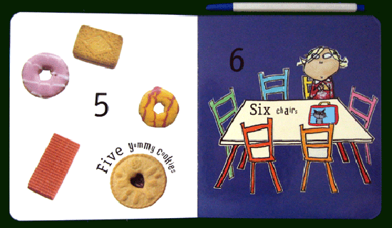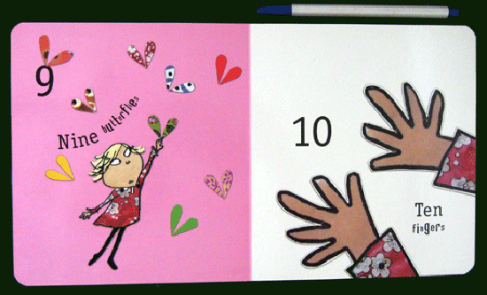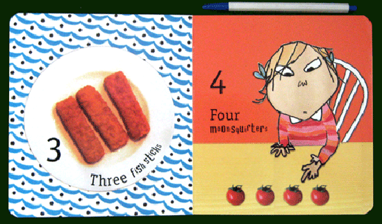Numbers are a popular topic for board books. Child has joined in with her counting book. The numbers are represented by a very odd assortment. Lola has one brother. Okay, that is not so unusual. But two toothbrushes with a lion standing next to her brushing his teeth - now that is unusual. Food is the focus for numbers three, four, and five - ranging from fish sticks to cookies. An odd number of socks represents seven and ten fingers, and a final spread showing more than ten elephants wrap up this lesson in counting from one to ten. It is a bit bizarre and Lola may not appeal to all kids. A companion to Charlie and Lola's Opposites.