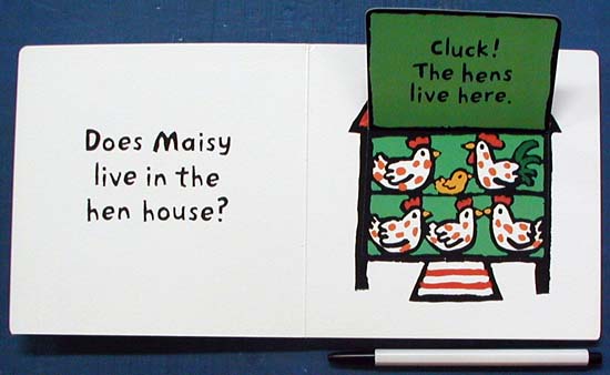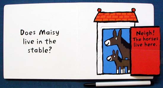 Guess where Maisy the mouse lives. Does she live in the pigpen? "Oink! The pigs live here." Does she live in the hen house? "Cluck! The hens live here." Does she live in the stable? "Neigh! The horses live here." With large, sturdy flaps, this pint-sized board book will appeal to every toddler's giggly sense of humor. (Silly! Maisy doesn't live in the dog house!) In her picture books about the endearing Maisy, the talented Lucy Cousins rustles up the ideal preschool picture-book recipe: simple, repetitive text and boldly outlined, brightly colored pictures. As Maisy's many devotees will attest, pretty much anything she does is worth reading about.