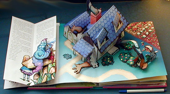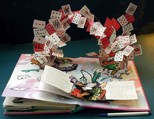 Moreover, Sabuda's faithful adaptation of the original Carroll text is a pleasure to read. It appears on separate page flaps that are pasted on the side of each of the six spreads, adjacent to an exploding main tableau that rather than simply unfolding, literally flies off the page (watch out for your eyes).