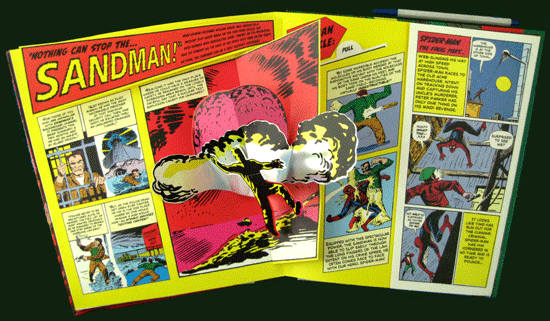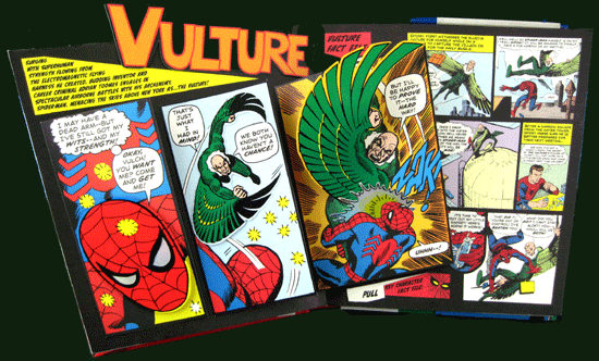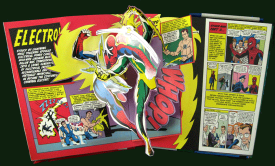 No wonder they call these comic books! This one is a pop-up of eight double-page spreads with super heroes popping up in the middle of each of them, and they are not all good guys, either! The chief requirement for becoming a superhero seems to be falling victim to some absurd accident that bestows super powers upon otherwise regular guys. Spider-man himself was bitten by a radioactive spider giving him the jumping power of a spider with its sticky web throwing capability, along with super strength per net weight and the ability to climb right up the sides of tall buildings. The Sandman, my personal favorite, happened to be crawling through a tunnel under an atomic energy plant when an unexpected nuclear accident turned him to loosely packed sand. This book, a "true-believers retro character collection," reviews some of the escapades of Spidey (as he is known to his friends) beginning in 1963 when he began working his way through hair-raising adventures against evil. Against Vulture, for instance, he was dropped to his doom into a water tower with no clue as to how he got out" After a narrow escape from the water tower, Spidey makes sure he is better prepared for their next meeting." Enhanced with shining metallic colors and a lot of "Wow!" "Blang!" "Whoom!" this will be an entertaining selection for comic book lovers.