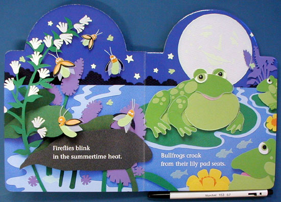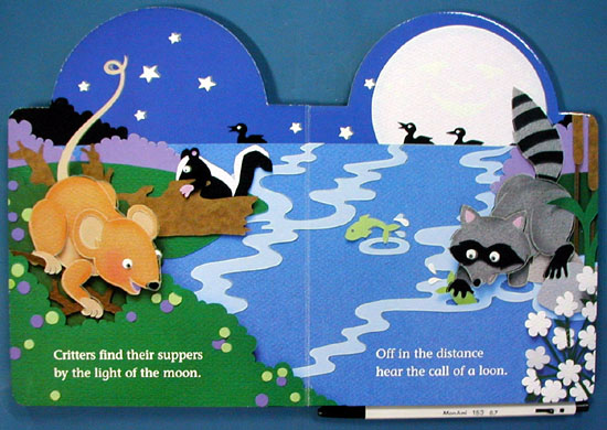 There's magic in this short board book designed to put the wee ones in a sleepy mood. As evening turns to night, the moon appears, illuminating all the nocturnal creatures as they go about their duties. The rhyming text describes the sights and sounds of a summer night, and when the reading is finished, portions of the book will glow after the lights are turned off. Just the right gimmick to encourage an early "lights out".