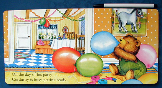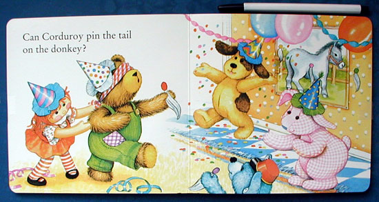 In Corduroy's Party, Corduroy celebrates his birthday with cake, games, and presents.