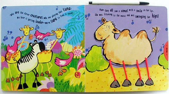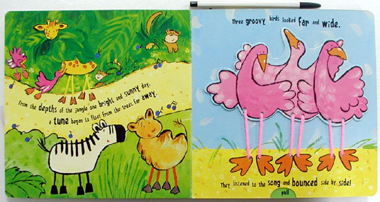 Will very young children be confused by all the references to music throughout a book that makes no sound? "Feel the groove! Pull the tabs and make us move!" In this book, pull-tabs between the double-thick pages activate the motion. Birds (pink but not identified), giraffes, a questionable-looking zebra, a camel and three monkeys move back and forth or up and down wiggling bright-colored yarn legs, or necks in the case of the giraffes, as they move. The words can be read in a strong rhythm. For instance, "From the depths of the jungle one bright and sunny day, a tune began to float from the trees far away."