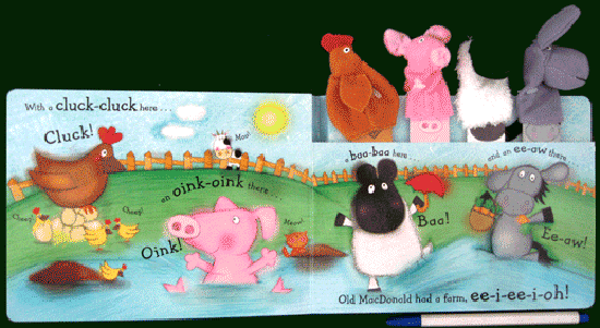 Featuring four different characters that live on Old MacDonalds farm, this book includes four fleece finger puppets that lets little ones have a fun time down on the farm. Full color.