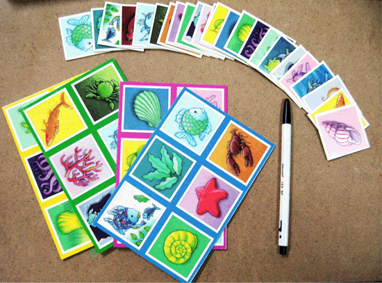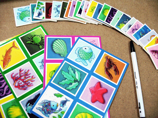 Match the pictures on the cards of Rainbow Fish, his friends, and objects from his watery world-all taken from Marcus Pfister's best-selling Rainbow Fish books-to those on the playing boards. Play alone and fill all four boards, or in a group where whoever fills his board first wins!