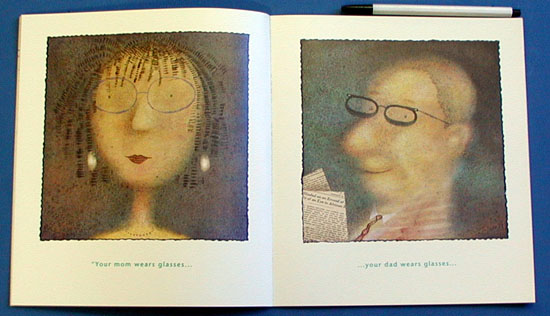 A boy who doesn't want to wear glasses argues with his doctor, who asserts that even space aliens and dinosaurs wear them. When the doctor sneaks a pair in front of his eyes, the skeptical boy sees that all the creatures really do wear glasses. The art, with its soft-edged areas of deep color punctuated by thin-rimmed spectacles, is perfectly suited to the story.
