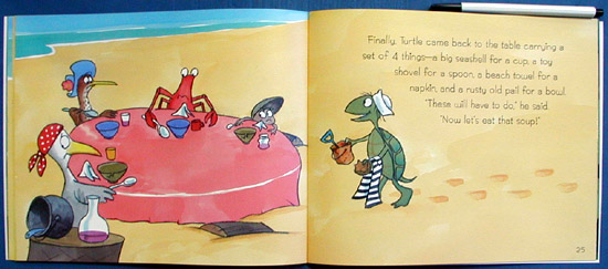 Murphy's humorous text indirectly teaches about sets as Turtle sits down to enjoy his thick green, gooey seaweed soup. Each time unsuspecting friends come by, they are invited to lunch and Turtle goes to his shelf to find extra place settings. When he runs out of an item, he makes another set with substitutes. For instance, a jelly jar serves for a cup, a toy shovel becomes a spoon, etc. Children will enjoy the story and its surprising ending while learning about the concept. The bright watercolor cartoons by the artist of "Froggy" fame lend a deft and humorous touch to the proceedings. The last pages have tips for further fun with math, suggestions for activities around the house, plus a short list of other stories with similar concepts. Well worth considering.