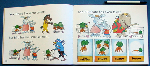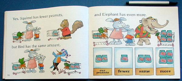 A trip to the grocery store with Mother Rabbit turns into a math lesson. As the young rabbits spot all the different vegetables and fruits that the store offers, they also learn all about comparisons and numbers. Horse has more carrots than Mother Rabbit does, Bird has the same amount and Elephant has fewer. Each page offers children an opportunity to comprehend the concept of more, fewer, and same. The author uses bright colors, familiar characters and repetition to entice young children back to this math lesson again and again. Level one of the "MathStart" series of books for young readers, this is an excellent book for reading with preschoolers. This series uses everyday situations to introduce math concepts for pre-school through second grade students. - Joyce Rice