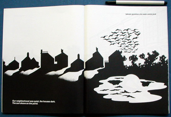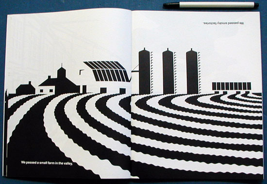Black and white illustrations and text record the sights on a day trip to the city and back home again to the country. The trip to the city is read from front to back and the return trip from back to front, upside down.