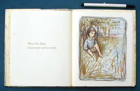 Children need time aloneuiet time to explore and to wonder at the worldnd sometimes adults may forget how new and surprising that world can be to kids. The little boy in this story spends some time by himself and reflects, realizing that when he is alone he hears more and sees more. He can hear the trees breathe and he can make out shapes in their tangled roots. He basks in the sun and stretches up to taste the sky, but he also thinks about his friends, wondering what they are doing, for he doesn't spend all his days alone. He just wants to live all by himself for a while. The artwork is done in watercolors and colored pencils and each picture appears sealed within glass, the moment captured as a precious memory. The story was originally published over twenty years ago, but today's children may need that sense of quiet, that interlude, more than ever because their days are often scheduled and busy. 2003 (orig. 1981), Greenwillow/HarperCollins, - Carolyn Mott Ford