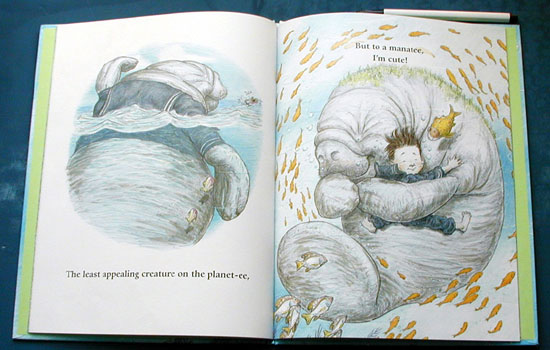 No difference between my face and fann-atee, A stately manatee. That's me. As a little boy falls asleep, his his pet guinea pig's water bottle begins to leak, filling the room with water, and the boy imagines himself to be a manatee. So begins an ocean adventure in which the manatee bonds with other undersea cratures, stops a boater from dumping trash overboard, and returns home -- a little damper-- in the morning.