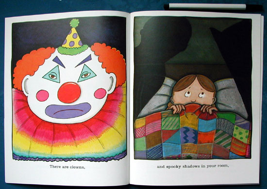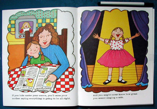Written on September 12, 2001, There's a Big Beautiful World Out There! by Nancy Carlson emphasizes overcoming fear. Though she acknowledges children's anxieties in everyday terms ("There's a lot to be scared of, that's for sure!/ There's that mean looking dog,/ and booming thunderstorms"), she also reminds readers of the good things they miss if they don't venture out ("If you hide under your covers, you won't see the rainbow after the storm").
