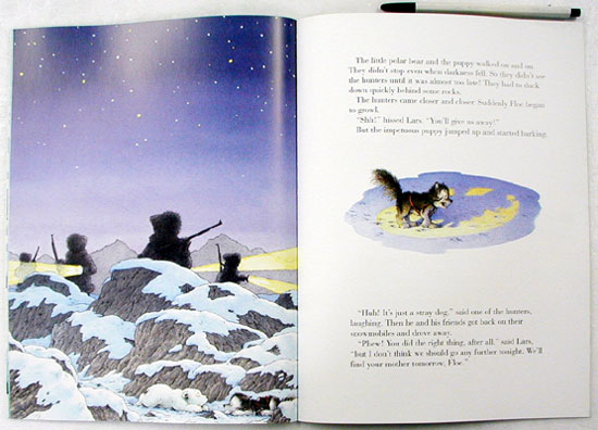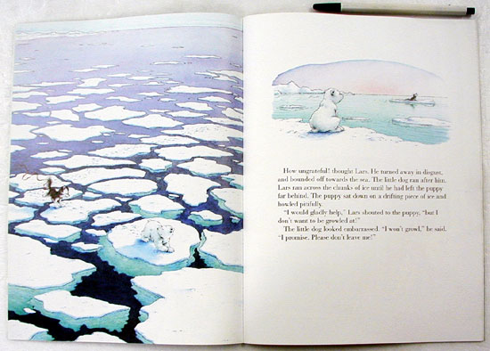 In this story, two traditional enemies, a young polar bear and a husky pup become friends. Lars, the polar bear, gets chased by a pack of husky dogs. Subsequently, he rescues a pup that is stuck in an icehole. A series of adventures ensues as he helps the lost pup find its mother and the pack. The pack is so pleased with Lars that they deliver him back to his parents on a sled. The story shows how a satisfying friendship can develop between contrasting characters, such as the pleasant bear and the feisty little dog in this case. The story familiarizes children with the North Pole--aided and abetted by the illustrations, which really do show the starkness and the coldness of the environment. - Maria Pereira
