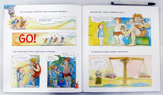 As he did in his book How Much Is A Million? author David M. Schwartz has created a second fun picture book that successfully teaches kids complex concepts. Here, he breaks down measurement systems into bite-size pieces that kids can put together to measure distance, weight, and size. First he explains how foot-long rulers, one-pound blocks, and the royal cup became standard measures. Then he explains that three feet equal a yard and that longer distances are measured in miles. He explains that weight is measured in pounds, that two thousands pounds equals a ton, and that ounces are used for weights less than a pound. All the while, he is leading up to the advantages of using the metric system, which has been adopted by nearly every country in the world. Though the United States has yet to fully adopt the metric system, Schwartz encourages kids to learn it so they can measure "like a world citizen." The colorful illustrations by Steven Kellogg are delightful. 2006, HarperTrophy