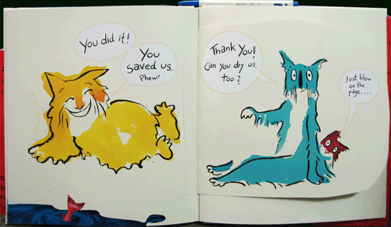 There they are, purring under a blanket. But not for long! Three sprightly cats named Tiny, Moonpie, and Andre are eager to involve you in their games, whether it's tossing a ball of yarn (oof!), lifting flaps to find them in boxes (comfy), or getting caught in a pillow fight (biff!). As their antics get wilder still, they'll need a kind soul to blow on the page to dry them off! With an irresistible story that directly engages the reader, this book's clever design and bright, gestural illustrations make for cat-tastic lift-the-flap fun.