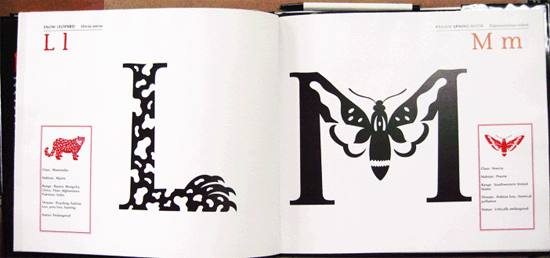 Although organized as a conventional alphabet book, the letters here are far from ordinary. McLimans has created a black-and-white iconic representation of 26 endangered animals, and his art is striking. For example, the newt's eyes protrude slightly from the sides of N, while its tongue emerges from the lower point. An accompanying box on each page includes a small, stylized red-and-white image of the animal plus information about its class, habitat, range, and threats to its survival. Back matter includes a paragraph about each creature along with a list of Web sites for organizations that help endangered animals and books for further reading. This title will serve more as a tool to raise awareness and a place to begin searching for information rather than as a source of facts. However, the arresting graphics and clean design will hold viewers' attention and create interest in the topic. The book could also serve as a starting point for art and design projects for students well above elementary school age.