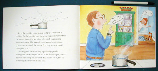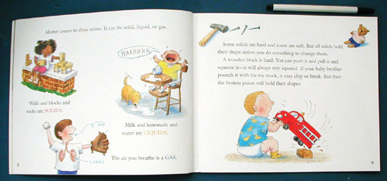 Solids, liquids and gases are the simple building blocks of science offered in this nonfiction trade book. With familiar scenarios and everyday items, children learn about the concepts of solids, liquids and gases. "If your sister spills milk on the table" shows how liquids spread out. A simple experiment, using a borrowed bottle of perfume and an empty room, demonstrates how gases spread through the air. When a demonstration demands more complex activities (such as using a hot stove to boil water) children are warned that they'll need an adult's help. In addition to showing children how to demonstrate several of these properties for themselves, this book also asks them to extend their thinking by imagining what the world would be like if heat and cold turned everything into solids, liquids or gases. "Can you imagine a world where your toys would melt when it gets too hot?" Familiar scenarios and items make the concepts understandable. Also, the predictable word patterns and pictures that are tied to the text aid comprehension for the youngest reader. The last page in the book offers several simple experiments that children can conduct with very little help from adults. Also included is a method of charting that introduces record keeping. This book is especially recommended for teachers who are looking for appropriate nonfiction books for primary-age children. Parents will find it interesting and useful as a supplementing to the science curriculum. - Linda Uhlenkott