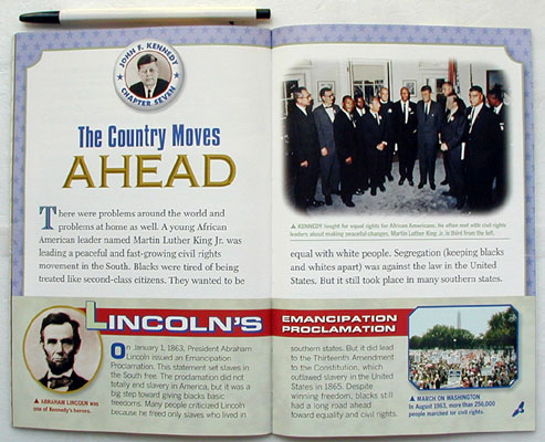 This title in the "TIME for Kids Biography" series uses frequent photographs of the Kennedy family, and newspapers from John F. Kennedy's time in the White House to show young readers his legacy. The era of Civil Rights is dealt with, Jacqueline Kennedy's support of the arts, her personal style, and the substantial renovation of the White House are also included. The essential facts and influences of JFK on American history are covered in interesting prose accessible to the average reader. The lively text is echoed in the inviting format: well-captioned pictures, occasional sidebars, and an interview with Hugh Sidey which gives the reader one person's recollections and opinions as to Kennedy's legacy. A short timeline is included.