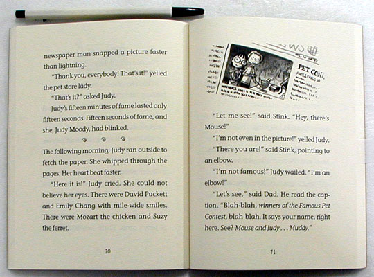 Third-grader Judy Moody is back in her second adventure for the young chapter-book crowd. She has a mood for all seasons, and this time it is jealousy. She thinks everyone else is famous except for her-even her parents and brother all have claims to fame. Sure that she'll be a winner when her cat makes toast for the "Famous Pet Contest," she loses to a boy whose chicken plays "Three Blind Mice" on a toy piano. In the end, Judy becomes famous anonymously after she steals some broken dolls from the hospital, fixes and cleans them, and mails them back, and the local newspaper picks up the story. To her surprise, she finds her secret even more satisfying than having everyone know who did the good deed. Funny black-and-white cartoons appear throughout. Dialogue is right on target for the character's age and feelings. The child's self-centered attitude may be tiresome to some adult readers, but kids will relate to her every concern. Look for future adventures of this feisty heroine, and don't miss her time in the spotlight.