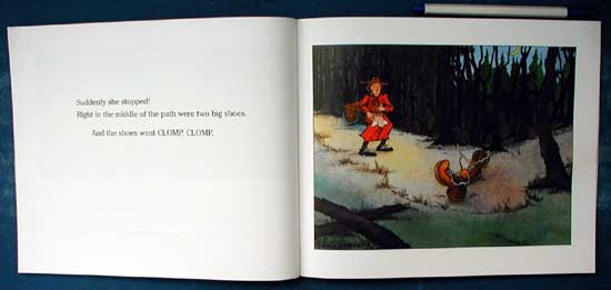 A delightful story of a brave little woman who, during a walk through the woods, finally starts to notice the shoes clomping behind her, the pants swishing, and others sounds. Her pace quickens until she makes a dash for her safe, snug little home. There is more to the story, and it has a happy not very scary ending, just right for the little ones. Book (1988) and audiotape for listening or reading along.