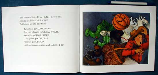 There is enough action and recurring CLOMP CLOMPs, WIGGLE WIGGLEs and SHAKE SHAKEs in Williams's first story to hold any young reader's attention. A brave old woman begins a walk in the forest where she meets two big shoes. Further down the path, a pair of pants, a shirt, two gloves, a hat and a pumpkin head come into sight, each trying to frighten her. When she's back inside her cottage, a KNOCK KNOCK challenges her to open her door. Again, the shoes, pants, shirt, gloves, hat and pumpkin head try to scare her, but find it impossibly discouraging. These assorted items have a callingto frighten someone or somethingand thanks to the ``little old lady'' they become the nastiest scare-crow ever. The fearless woman's brave showing, and her determination not to be afraid, should strike a note of familiarity with children. Lloyd's dark forest settings, wriggling clothing and homey interiors are a perfect complement to the text.