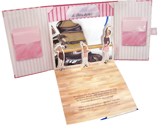It's a pop-up and fold-down book that's just so much fun! Little girls will dress up Gigi and her best friend Frances the play in four 3-dimensional scenes from all of the Gigi storybooks. Includes cutout figures, static cling costumes and props. Join Gigi and Frances for a fun-filled day as God's Little Princesses! Bright and early, but still a little sleepy, the girls meet at ballet, then got to the soccer game where Francis plays and Gigi cheers. A little messy for a true princess, they rush home just in time for tea and then end the day with a sleepover at Gigi's house and a good night prayer.