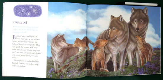 George uses a journal approach to illuminate the first 10+ months of life for three wolf pups born to an alpine tundra pack. Each entry in the "diary" is prefaced with a message (in colored inks) to readers/listeners living south of the area telling them how to keep "tundra-time" in the framework of their own seasons. "When you see dandelions turning silver...." "When the yellow warblers return...." "When you are eating fresh blueberries...." Then, George writes, "Look to the north" and in the following paragraph(s), she describes the pups, their gradual development, and their environment. The lyrical text is accompanied by large, realistic acrylic paintings of the adult wolves, the pups, and their habitat along with small cameos of the southern remindersa clump of dandelions, a yellow warbler (the illustrator should consult a Peterson guide), ripe blueberries, etc. The author's research is impeccable, and her affection for her subject evident, affirmed in a personal note. Children will take pleasure in the simply worded narrative and the warm pictures, and will store some accurate wolf data in their memories, as well as take stronger note of their own habitats as they keep an eye out for dandelions, for fresh blueberries on the table, and for Halloween jack-o-lanterns on front porches.Patricia Manning, formerly at Eastchester Public Library, NY