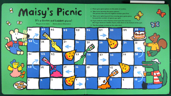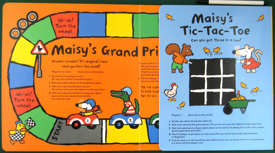 And finally, with the help of the giant oversize interactive board book Maisy's First Game Book by Lucy Cousins, and Maisy's pals (which double as game pieces), readers learn how to play Tic Tac Toe, use a spinner (numbered from 1-4) and play a version of Chutes and Ladders at "Maisy's Picnic." Kids will have so much fun they'll hardly notice that they're learning to count, identify colors and more.
