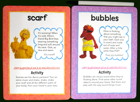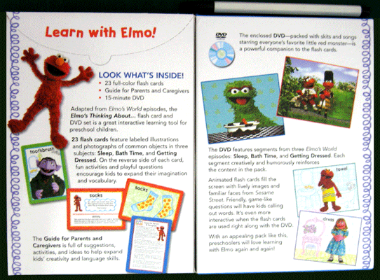 This flashcard and DVD format is the ideal blend of fun and enrichment to enhance a preschooler's intellectual development. This unique flash card and DVD set comes complete with 23 full-color flash cards that include simple activities on the back, a guide for parents and caregivers, and a 15-minute DVD featuring segments from 'Sesame Street Elmo's World' that focuses on sleep, bathtime, and getting dressed.