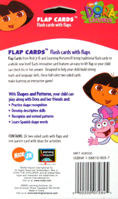 Flap Cards from Nick Jr. and Learning Horizons bring traditional flash cards to a whole new level! Each innovative card features an easy-to-lift flap so your child can check his or her answer. With Shapes and Patterns, your child can play along with Dora and her friends and: practice shape recognition; develop descriptive skills; recognize and extend patterns; learn Spanish shape words. Includes 26 two-sided cards.