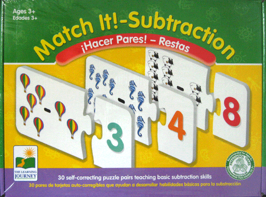 This colorful box of 30 sets of Match It! Subtraction puzzle cards provides children with an introduction to mathematics focusing on the development of subtraction skills. The cards are self-correcting as no two puzzle cuts are the same. Match It! Subtraction teaches the basic elements of mathematics in a fun and easy way. Recommended for ages four and up. Bilingual English and Spanish packaging.