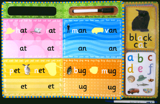 Wipe-clean pen with eraser encourage practice on wipe-clean board pages. Re-usable stickers and 26 wipe clean flashcards encourage participation, handwriting practice and sound recognition.