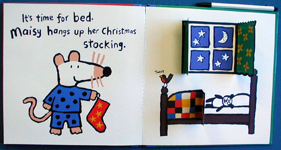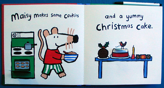 Maisy is getting ready for Christmas--she is wrapping presents, baking cookies and trimming a tree. On every page there are flaps for kids to lift. They show who is at the door, what is in the packages, and what is in Maisy's Christmas stocking. A little robin is also on every spread and kids will have fun finding this cute little bird. The simple, bold illustrations in bright colors have lots of appeal to new and old Maisy friends.