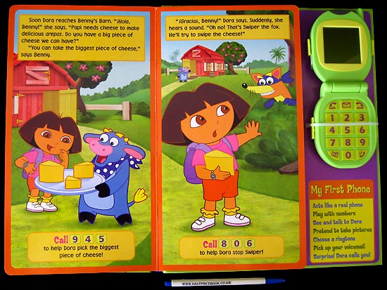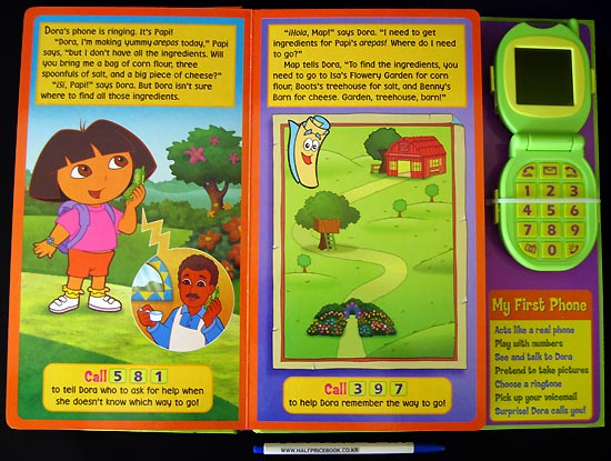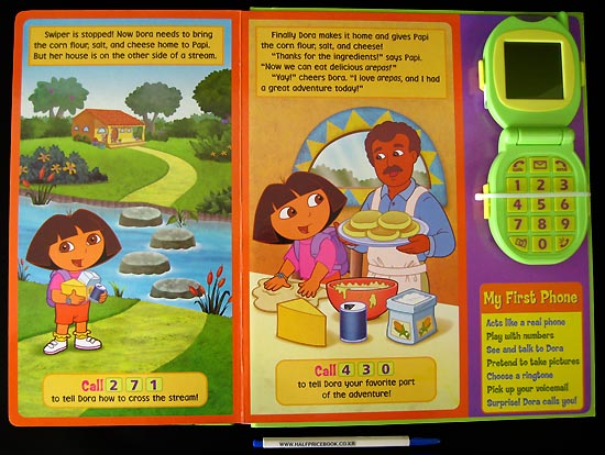 Dora's calling to invite you on an adventure! Papi is making arepas today, but he's missing some ingredients. Dora visits Isa, Boots, and Benny to get the ingredients for Papi. Children are prompted throughout the book to call Dora, with the included detachable 15-button toy cell phone, to help her count in Spanish, overcome obstacles, and stop Swiper! Children can use the cell phone to press the buttons to call Dora, to answer calls from Dora, and to get messages. While Dora talks, her animated image appears on the LCD screen. The phone plays five different ring tones, and includes "Camera" and "Voicemail" buttons that play and display exciting sound effects, pictures, and animations.