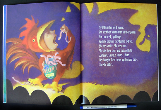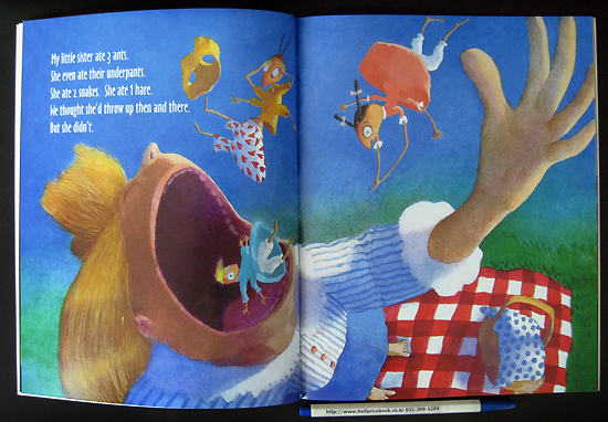 Kindergarten-Grade 3-A counting book that talks about swallowing slimy creatures, ant's underpants, and regurgitation, and has outrageous illustrations is a guaranteed success with the primary-grade crowd. The cumulative rhyme has the irreverence of Silverstein or Prelutsky and the art has the rollicking humor of Lane Smith. A young magician, the narrator's sister, puts on a show, eating one hare, two snakes, etc. She isn't grossed out by consuming any bat or shrew, but give her nutritious food and watch out. The text is enriched by the inclusion of just parts of previous number rhymes, so the narrative doesn't become totally repetitive. The "low fat" worm jar with our heroine dressed as a chicken and the shrews walking the sword "plank" into oral doom are just two of the priceless pictures. The anticipated ending is awesome with stunned critters everywhere, even on the audience of the magic show. One of the biggest treats in teaching is listening to youngsters laugh, and laugh they will at My Little Sister Ate One Hare! Bravo! Encore!-Mollie Bynum, formerly at Chester Valley Elementary School, Anchorage, AK