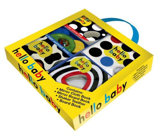 The Hello Baby Gift Set contains a mirror board book, a shaker teether, a cloth book, and a grip book.