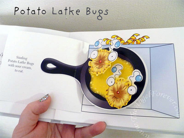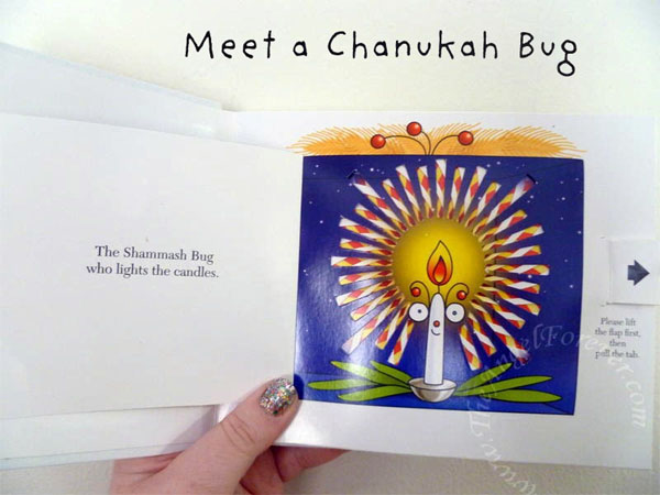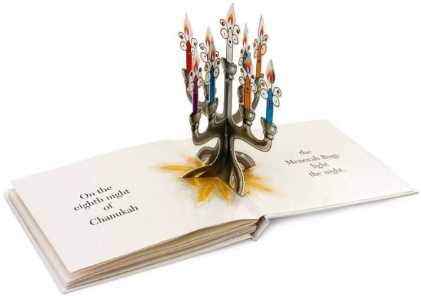 Creators of novelty formats for other holidays now approach the Festival of Lights. David A. Carter presents Chanukah Bugs: A Pop-up Celebration. Each spread features a flap designed to resemble a gift box, one for each of the eight nights. Among the pop-up "presents": a Dizzy Dreidel Bug that spins and Menorah Bugs "lit" by silver-paper flames.