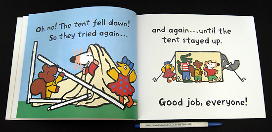 Maisy, the little mouse, is back with a new adventure and all her friends. Like previous Maisy books, this one is bright and bold, with one, large-font sentence on each page and a joyous cast of characters rendered with simple lines and solid blocks of color. In other words, it is a perfect book to share with toddlers and preschoolers, either one-on-one or with a group at "circle time." In this story, Maisy and her friends work together to pitch a tent, laugh at several mishaps, sing around the campfire, then count how many of them can fit into the tent as they go to bed for the night. Young children will particularly enjoy seeing Eddie, the elephant, try to get into the tent after everyone else, creating a "squeezy squish-squash," that finally sends everyone but Eddie popping back out of the tent. This is a book preschoolers will want to read again and again.