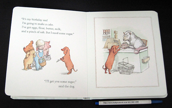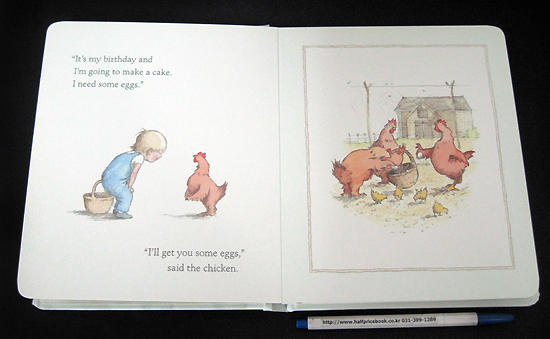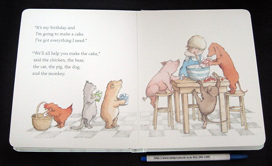 In a brightly illustrated cumulative tale, an ever-growing group of friends helps a small child gather the ingredients for a delicious birthday cake.
