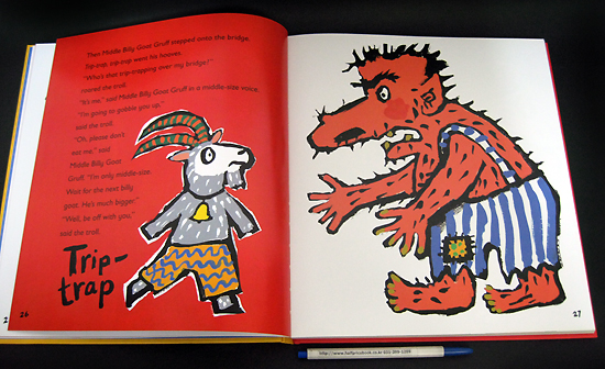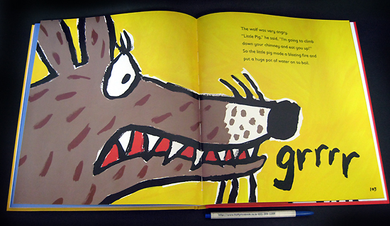A glance at wolf on the books jacket, sharp claws and teeth at the ready, will reassure readers that this is no pastel, bowdlerized version of folklore. Yes, a hunter chops off the head of Red Riding Hoods wolf, but the deed is so matter-of-fact in the telling and so bloodless and cartoon-like in the illustration that children are unlikely to flinch when justice is done.