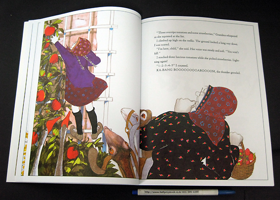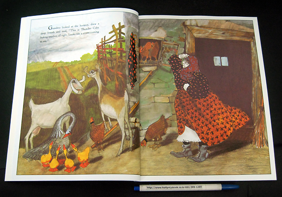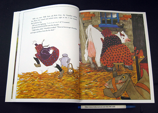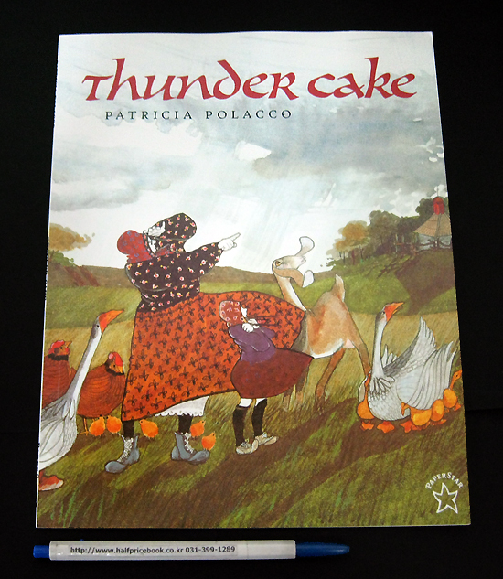 In Thunder Cake , a grandmother helps her granddaughter overcome her fear of thunder by baking a special cake while a storm threatens. Although the book's concept is good, it does not fulfill its promise. The story is poorly paced: the storm approaches rapidly, but does not break for several pages as Polacco crams in details, including a lengthy pause while the cake bakes. The illustrations are less than appealing: both characters' faces are chalky white, draining them of life. Many of the barnyard animals are drawn out of proportion--Grandmother is almost the same size as a cow she milks, geese are as tall as people. Considering how many children are afraid of thunder, it is a shame Thunder Cake is not a stronger effort. Ages 4-8.