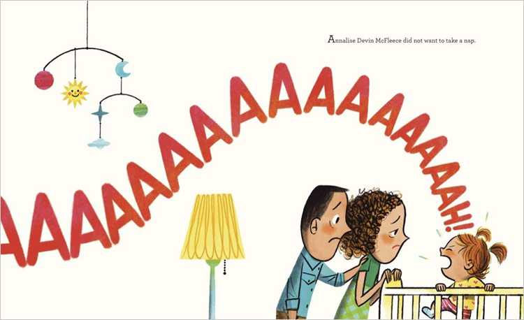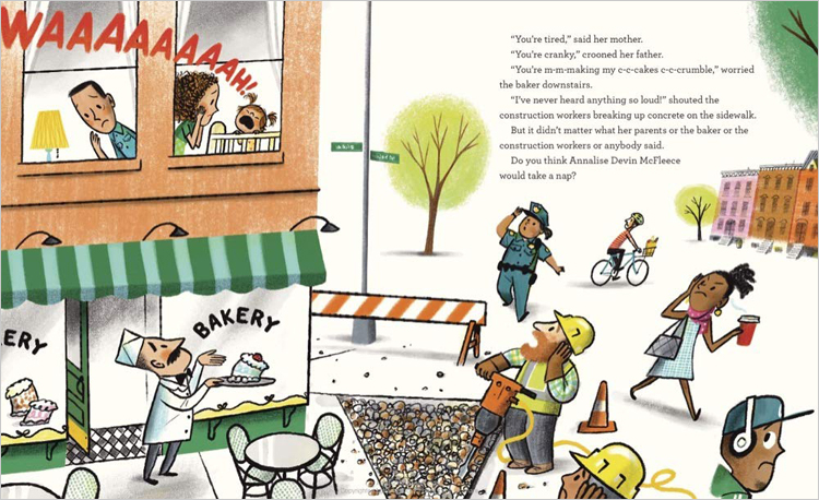 It's time for a nap but, just like stubborn toddlers everywhere, Annalise Devin McFleece won't have anything to do with bedtime. Dad tries to encourage sleepiness by pushing her around the park in her stroller. Along the way, they pass a man sitting on a bench, dog walkers walking dogs, a boy on a skateboard, kids playing ball, a girl practicing her juggling, and others. Each of them thinks that taking a nap is a great idea and if Annalise Devin McFleece doesn't want hers, they'll happy take it. And one by one, everyone falls asleep...except Annalise Devin McFleece. But when she's finally ready for her nap, all the naps are taken! Is there anyone who has an extra nap to spare?