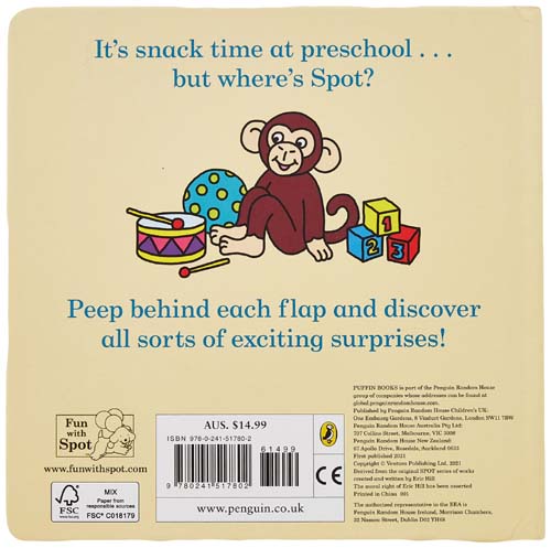 It's Spot's first day at preschool, and he can't wait! There are lots of fun activities to try and games to play with his friends... but when it gets to snack time, Spot has disappeared! Where has he gone?