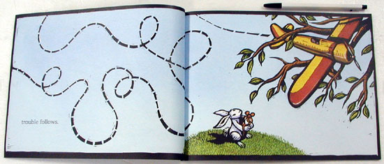 When Mouse lets his best friend, Rabbit, play with his brand-new airplane, trouble isn't far behind. Of course, Rabbit has a solution -- but when Rabbit sets out to solve a problem, even bigger problems follow. Every child who's ever had someone slightly bigger or slightly older over to play will recognize this story about toys and trouble and friendship. Eric Rohmann's third picture book is illustrated with robust, wonderfully expressive hand-colored relief prints -- the perfect vehicle for a simple, heartfelt tale about childhood.