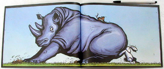 Best known for fluid, superbly realistic oil paintings, Rohmann (Prairie Train, 1999, etc) switches to thick-lined colored woodcuts and a simpler pictorial style for this nearly wordless, engagingly wacky episode. After carelessly throwing little Mouse's airplane up into a tree, Rabbit finds a unique way to reach it. ("Not to worry, Mouse. I've got an idea!") Industrious, if not too practical, he drags in a reluctant bear, a crocodile, a purple hippo, and other animals, then stacks them atop a wobbly-legged elephant. Great is the inevitable fall thereof, but Mouse and airplane are reunited, and Mouse, being a true friend, swoops down to rescue Rabbit from the now-annoyed menagerie. Rohmann uses wordless, and sometimes even empty, frames to great comic effect, allowing huge animals to make sudden entrances from the side-or from above, and artfully capturing the expressions on their faces. Young readers and pre-readers will chortle at the silliness of it all while enjoying the sometimes-demanding friendship between these disparately sized chums.