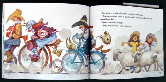 Katie and Cameron are at the rodeo, not only to watch, but also to help their uncle, Cactus Joe, the best bull rider in Texas. They must water the horses, catch loose calves, and hand out winning ribbons. At first, they don't get things done on time, but, through trial and error, they learn to create a schedule that enables them to perform their tasks and still watch the events. Math concepts are neatly integrated into the story as the two kids to learn to manage their time and see their uncle win the Bull Riding Championship. Wenzel's lively color cartoons create an authentic environment and enhance the excitement and suspense of the story.
