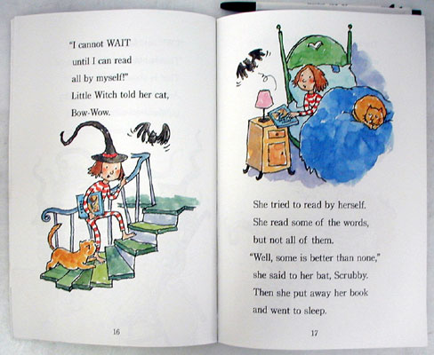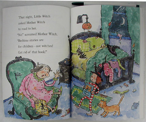 Little Witch's family is not at all helpful when she is learning to read, so she hides her books and reads by flashlight until late at night and becomes so sleepy that she cannot stay awake during the day.