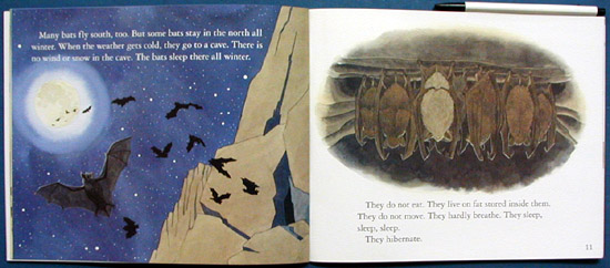 Originally published in 1963, this revised and updated series title adds even more allure to its nature lesson with a new full-color format and the inclusion of suggestions for easy ways to feed animals in winter. Davie's brightly colored paintings bring the revised text to life through the realistic portrayal of animals, birds, and butterflies in their natural habitats. In addition, the diagrams of the woodchuck's underground tunnels and illustrations showing a pika and bats asleep in their winter burrow and cave provide concrete examples of the term "hibernation." The rural neighborhood setting featuring houses, gardens, and two children on the first and last pages adds a note of familiarity. This brief, simple introduction to animal survival in winter contains just enough facts to satisfy youngsters' curiosity, and the attractive format makes learning fun.