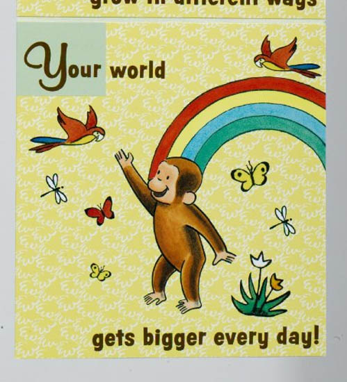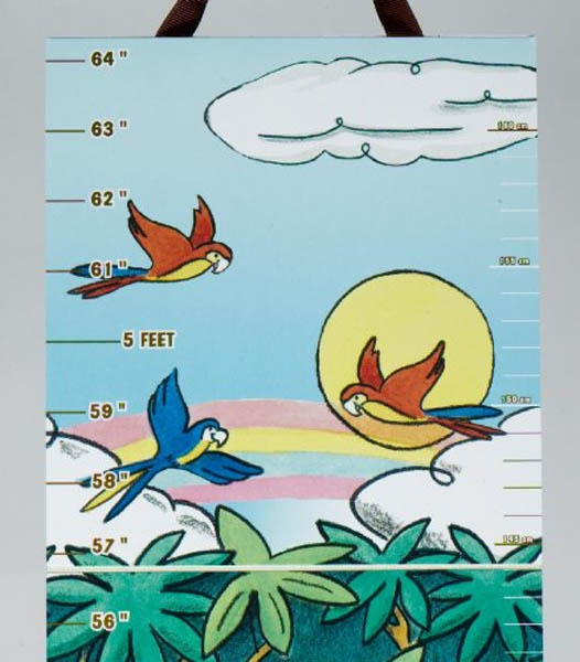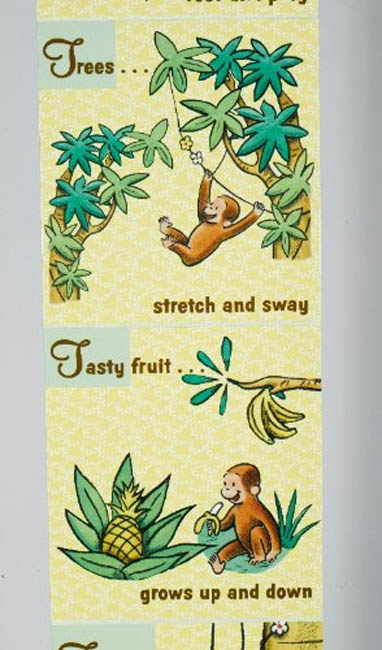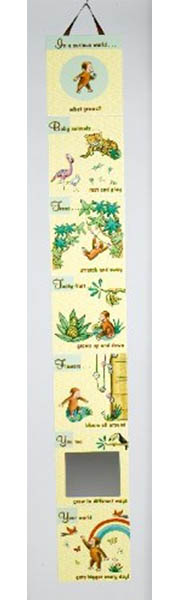 A colorful fold-out board book and growth chart -- parents and little ones wont want to miss an inch! Celebrate growing little ones and their growing worlds with this beautiful fold-out board book. Parents and babies can use one side of the book to discover a variety of growing things through charming images of swaying trees, tropical fruits, baby animals, a celebratory poem, and a mirror so baby can watch herself grow. Flip the book over for a gorgeous growth chart that helps parents track their childs height, inch by colorful inch. This book is made of sturdy, lightweight board with a ribbon hanger to be securely hung on a wall. The book comes packaged in an elegant gift box and includes a sheet of Curious George stickers and height markers for the growth chart.