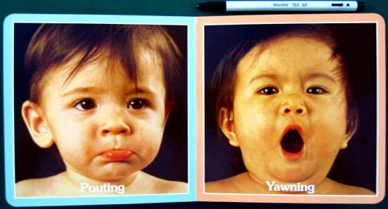 This six- inch board book contains ten page-size photographs of babies with various expressions on their faces. The author describes each expression with simple text appropriate for the youngest children. The book has several excellent features, including the use of a diverse group of children as models, and the use of large, distinct photos against a black background. There are one-word descriptions of each baby's expression on many of the pages. Laughing, crying, pouting, smiling, thinking, yawning and yelling are all portrayed along with several other actions. The full text is a simple rhyme composed of 20 words, which follows the babies' expressions. Children will enjoy looking at the baby faces and will learn to connect the expression with the word that describes it. The author has a companion book entitled SMILE!, which follows the same format. They are part of Scholastic's Baby Faces series.